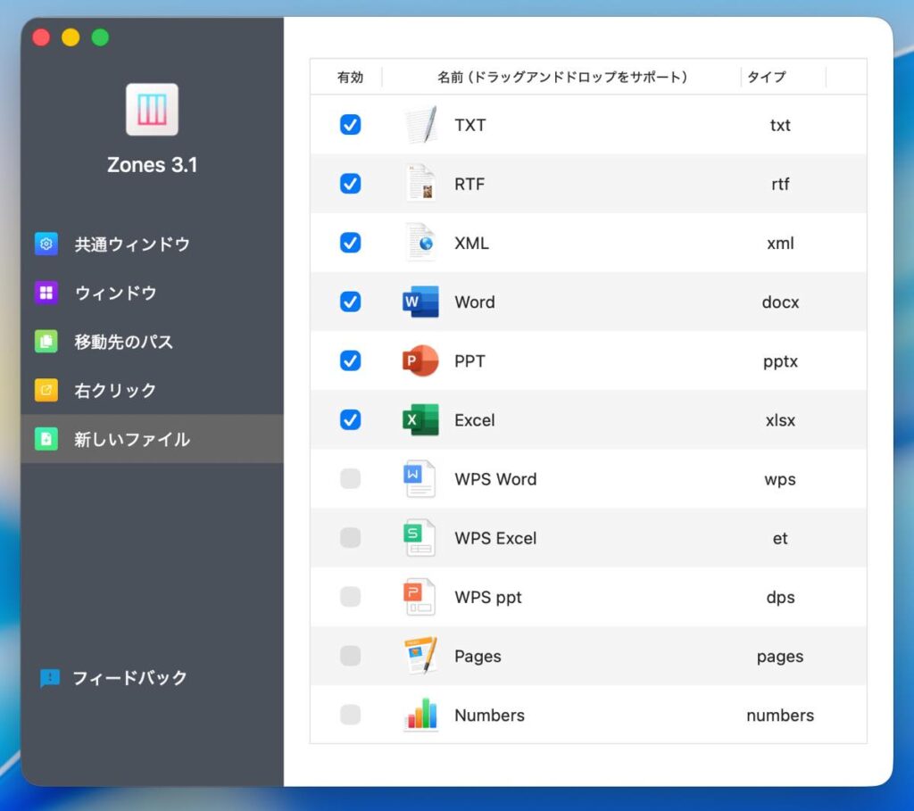 設定画面の「新しいファイル」のリストにチェックを入れておけば、ゾーン右上の「≡」やポップアップメニューから各形式の新規ファイルを素早く作成できます